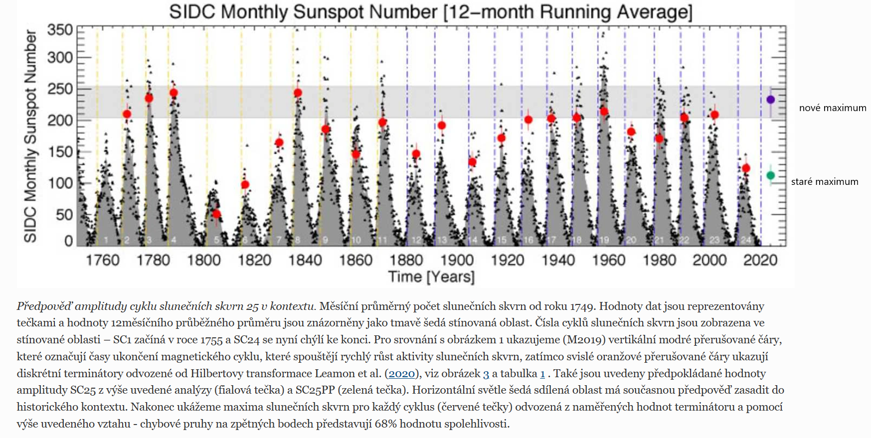 Jo, pěkné, a mám další zajímavost ohledně toho, že někteří vědci očekávali v současné době velké sluneční minimum, bohužel, je to zcela přehodnocováno, aktivita bude patrně velmi vysoká, protože byl prý při původní predikci upozaděn Gleissbergův cyklus, což vedlo k omylu, čili ani případnou novou "malou dobou ledovou" se nemůžeme již utěšovat, že by pomohla.. přikládám screen, je tam na konci predikce stará (zelená tečka) a predikce nová (modrá tečka) plus odkaz na případné pročtení - https://link.springer.com/article/10.1007/s11207-0...