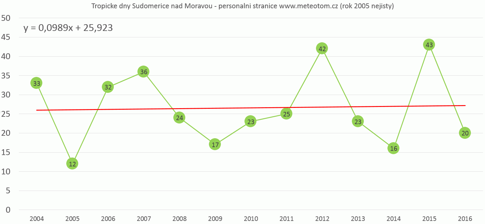 Počet tropickýchz dnů je velmi vysoký, ale o dost nižší než Kunovice. Yřejně je stanice Kunovice nějaká specifická. Trend počtu tropických dnů je v Sudoměřicích nevýrazný, také kvůli chybějícím rokům 2000-2003.