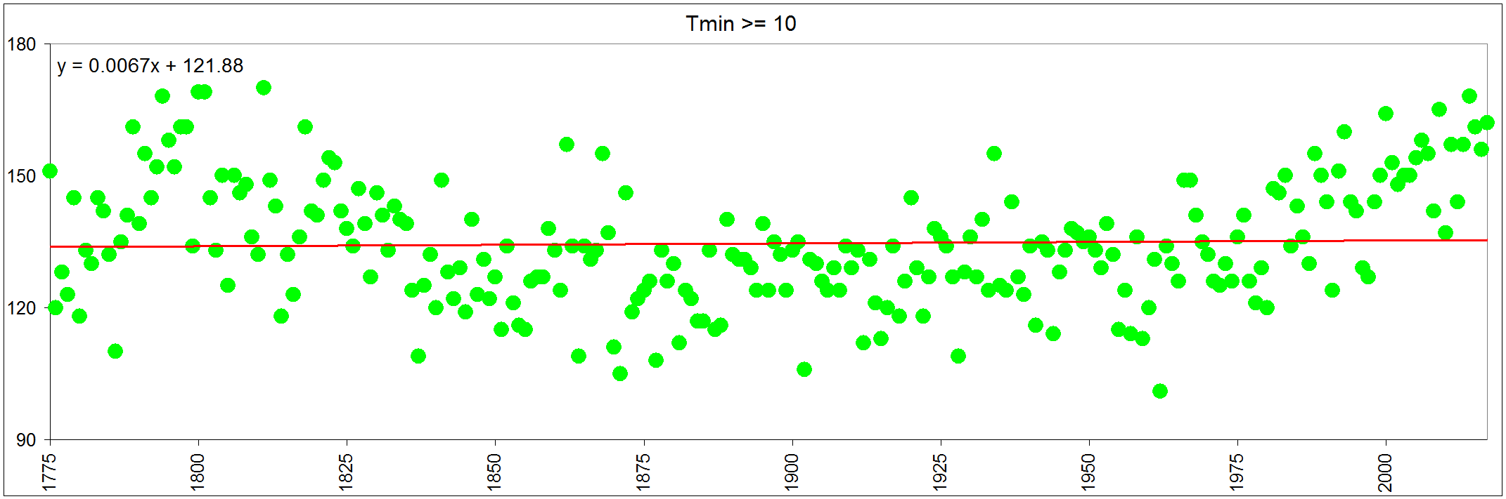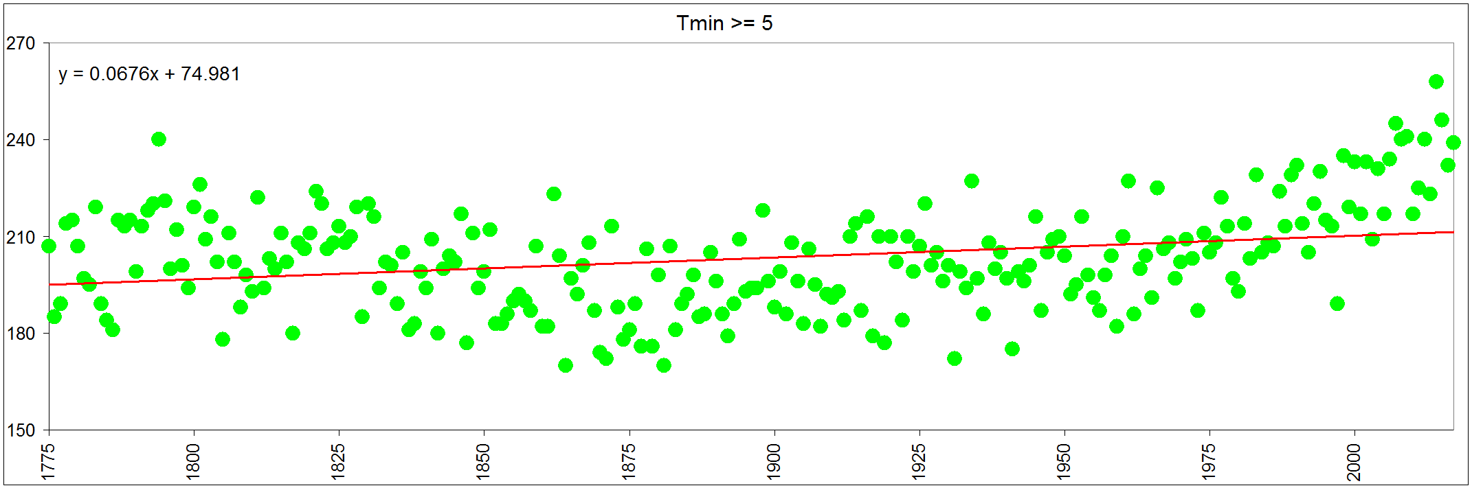 V pripade poctu dnu s danou charakteristikou se objevuje podobny vyvoj, nekde to vypada i na dlouhodobe cykly. V prvnich desetiletich je vice teplych noci, mene letnich dni a pod. Nejaka nizka amplituda. Drive byly roky bez tropickeho dne, i malo letnich dnu. Ale v poslednich desetiletich vymizely zase dny arkticke, nebo minima pod -20. Cim dal do historie, tim delsi zimy, hlavne v 16-17 stoleti. To se nemerilo, jsou ale zminene nektere ledove jevy.