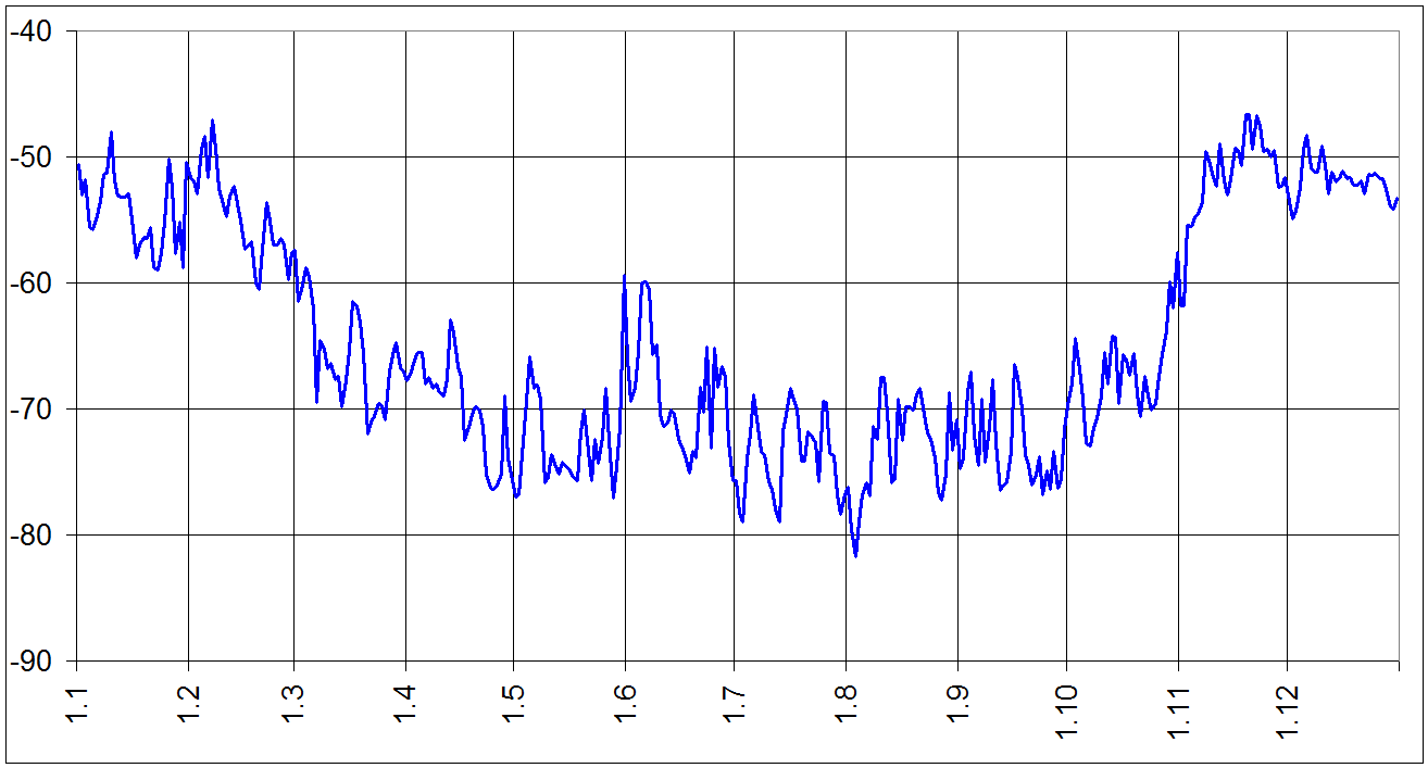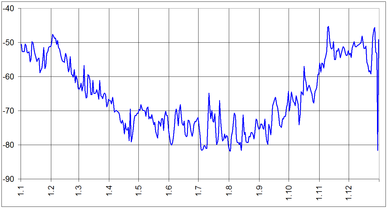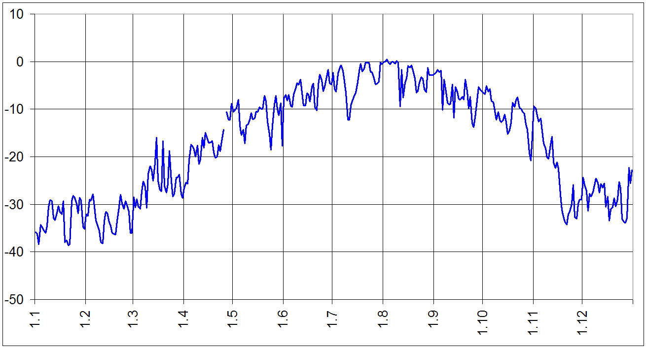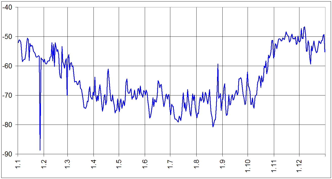 Extremy z celeho sveta - Rocni grafy 2000-2017, Nejnizsi minimalni teplota Tnn, bez rucniho odstraneni chybnych hodnot (v pripade celeho sveta prilis slozite). Nejvyssi maximalni teplota Txx obsahuje podstatne vice chybnych hodnot nez Nejnizsi minimalni teplota Tnn. A Nejvyssi denni srazky obsahuji podstatne vice chybnych hodnot nez Nejvyssi maximalni teplota Txx. Prakticky temer vsechny dny je nekde dosazeno pod -40 °C (aspon jedna SYNOP stanice ve svete), az na velmi malo vyjimek - 13.12.2003 bylo minimum ze vsech SYNOP stanic -39.4 °C. V dobe zimy na severu vede Asie a Gronsko, jinak po vetsinu roku Antarktida. V dobe leta v CR jsou celosetova minima z Antarktidy i pod -80 °C. Avsak za cele obdobi 2000-2017 minimum z celeho sveta 27.01.2014 -88.7 °C je evidentni chyba.