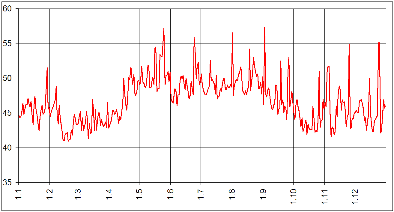 Extremy z celeho sveta - Rocni grafy 2000-2017, Nejvyssi maximalni teplota Txx, bez rucniho odstraneni chybnych hodnot (v pripade celeho sveta prilis slozite). Hodnoty nad +55 °C jsou spatne. Nejvyssi maximalni teplota Txx obsahuje podstatne vice chybnych hodnot nez Nejnizsi minimalni teplota Tnn. A Nejvyssi denni srazky obsahuji podstatne vice chybnych hodnot nez Nejvyssi maximalni teplota Txx. Prakticky temer vsechny dny je nekde ve svete dosazeno +40 °C (aspon jedna SYNOP stanice ve svete), az na velmi malo vyjimek,ktere mohou byt dany i nedostupnosti dat z urcitych regionu.