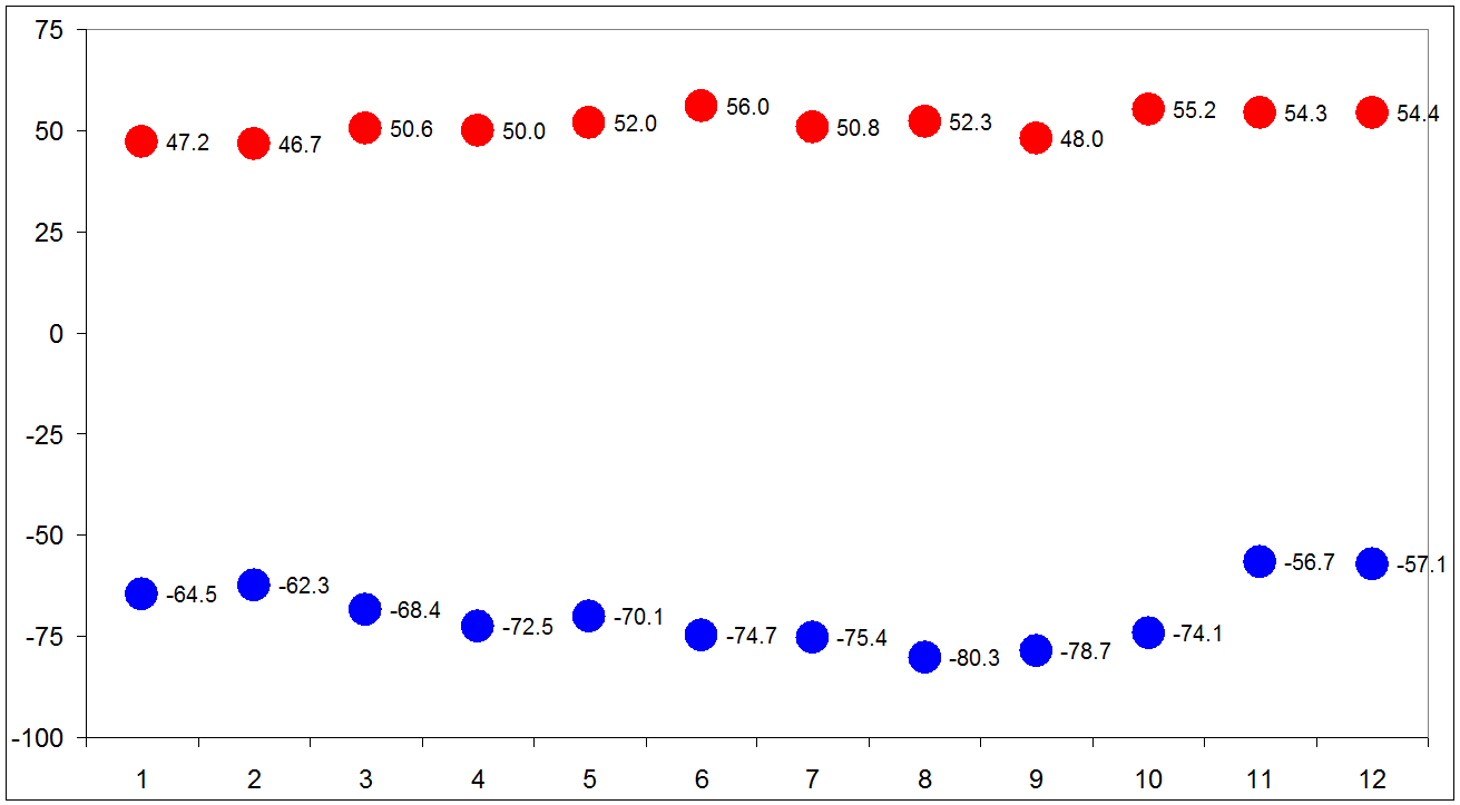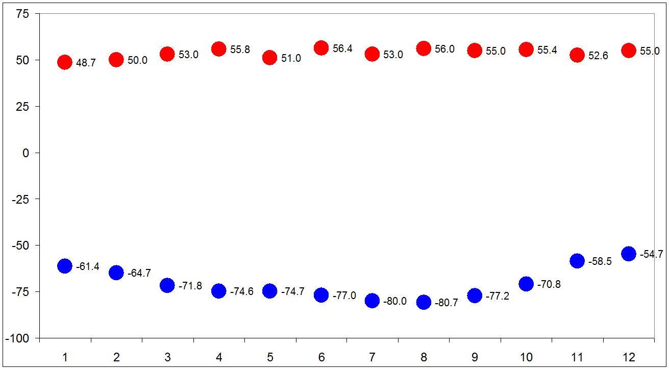 Extremy z celeho sveta - Rocni grafy 2000-2017, Nejnizsi mesicni minimalni teplota Tnn a Nejvyssi mesicni maximalni teplota Txx, bez rucniho odstraneni chybnych hodnot (v pripade celeho sveta prilis slozite). Nejvyssi maximalni teplota Txx obsahuje podstatne vice chybnych hodnot nez Nejnizsi minimalni teplota Tnn. A Nejvyssi denni srazky obsahuji podle vseho podstatne vice chybnych hodnot nez Nejvyssi maximalni teplota Txx. Prakticky temer vsechny dny je nekde dosazeno pod -40 °C (aspon jedna SYNOP stanice ve svete), az na velmi malo vyjimek - 13.12.2003 bylo minimum ze vsech SYNOP stanic -39.4 °C. V dobe zimy na severu vede Asie a Gronsko, jinak po vetsinu roku Antarktida. V dobe leta v CR jsou celosetova minima z Antarktidy i pod -80 °C. Avsak za cele obdobi 2000-2017 minimum z celeho sveta 27.01.2014 -88.7 °C je evidentni chyba. U Nejvyssi maximalni teploty Txx hodnoty nad +55 °C jsou spatne. Prakticky temer vsechny dny je nekde dosazeno +40 °C (aspon jedna SYNOP stanice ve svete), az na velmi malo vyjimek, vyjimka muze byt zpusobena i nedostupnosti dat. Zde jsou v grafech hodnoty Nejnizsi mesicni minimalni teploty Tnn a Nejvyssi mesicni maximalni teplota Txx za cely mesic, kvuli castym chybam v maximech bude prakticky porad celo-mesicni maximum spatne, u minim by mela byt situace lepsi.