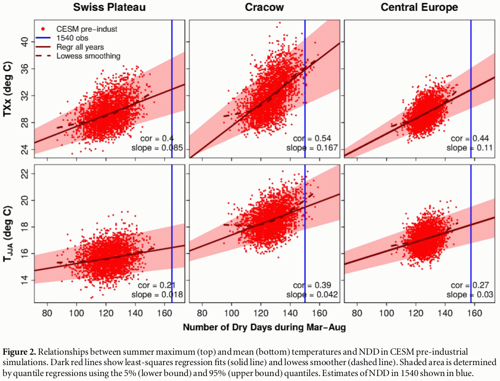 Na zaklade klimatologicke simulace v preindustrialnim obdobi 3000 let na zpet byla odhadnuta prumerna teplota a absolutni maximum teploty v lete 1540 na zaklade pravdepodobnosti. Rozliseni je 1.9x2.5 stupne, coz neni tolik, ale dlouhe simulace jsou extreme vypocetne narocne i pri malem rozliseni. Pravdepodobnost prekroceni prumerne letni teploty z roku 2003 a absolutniho maxima je polovicni, cca 40-70%. Prubeh leta 1540 byl odhadovan pro Krakov v Polsku nedaleko Tater, ve stredni Evrope (CR), v nizine (o neco chladnejsi, nez niziny v CR) v severnim-centralnim Svycarsku (o neco teplejsi, nez CR).