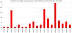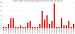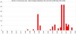 Graf č. 2 - počet záznamů (den-stanice) průměrné denní teploty +30.0 °C a více v jednotlivých měsících 1961-2025. Alespoť jednou se v ČR objevila průměrná denní teplota +30.0 °C a více v 19 měscích z celkových 780 měsíců v období 1961-2025. Seřazeno chronologicky.