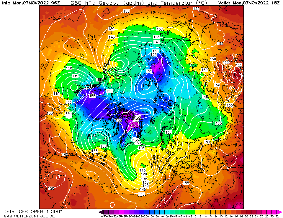 Arkida a severni polokoule GFS Wetterzentrale 07.11.2022 06 UTC +9 hod na 15 UTC (na zapade Kanady je to rano).