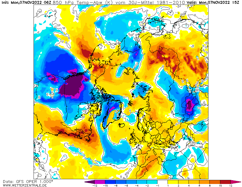 V Ceske Republice se odchylka teploty v 850 hPa od normalu -12 °C a mene vyskytuje velmi zridka a v lete vice-mene nikdy, na podzim, v zime, zacatkem jara nekdy ano - mj. napriklad koncem unora 2018, nebo pri snehove kalamite v pulce rijna 2009 a v mnoha jinych situacich. Naopak kladna odchylka od normalu +12 °C a vice se v CR objevuje casteji (napr. koncem rijna 2022 na pomerne velke plose). Na zapade Kanady vsak odchylka teploty v 850 hPa dosahne hodnot az pod -20 °C odhadem z mapy.