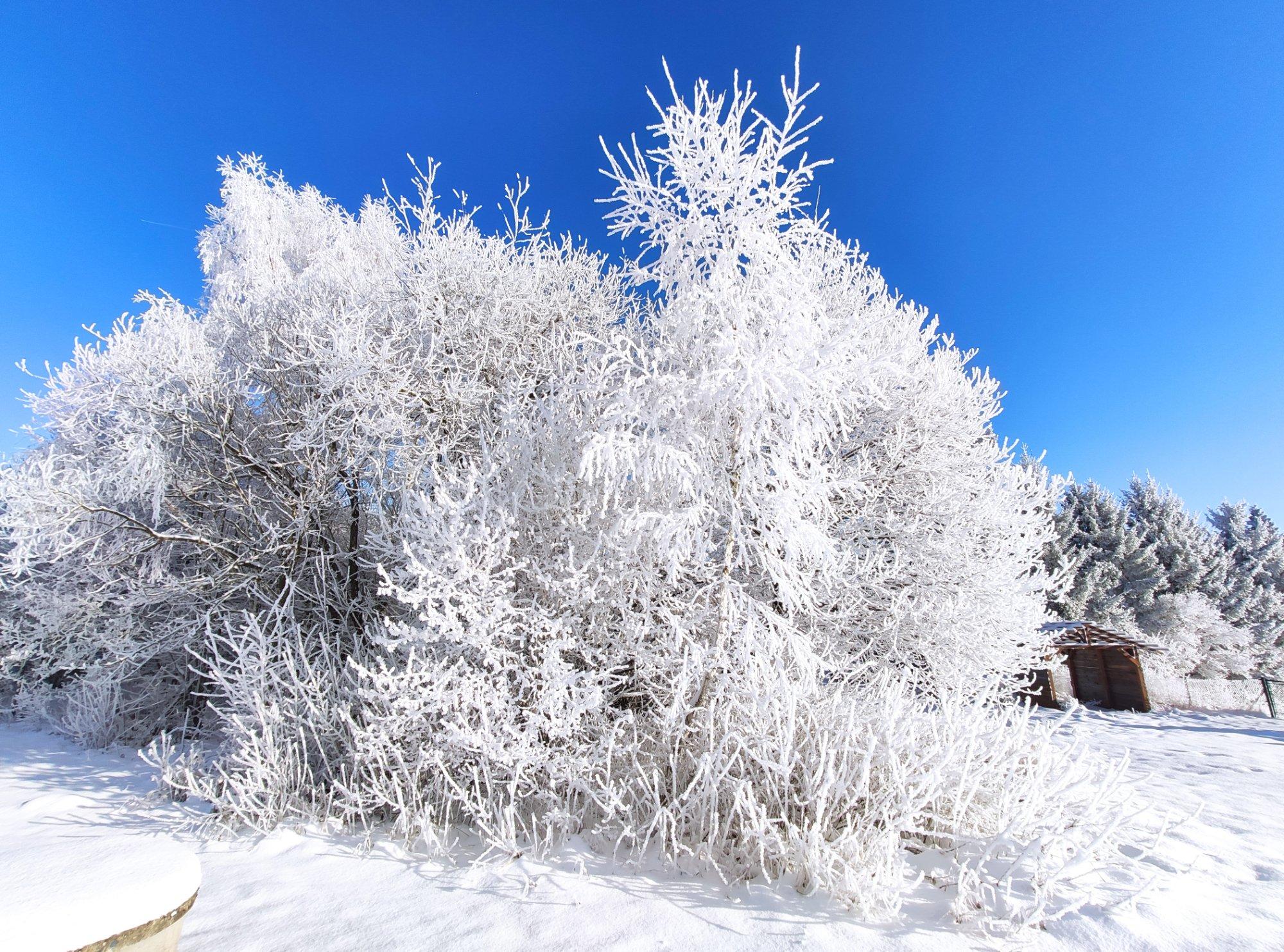 Námraza je dole na stromech u řeky už od rána, ale dle zkušeností je vždy nakonec nejvíc na svazích o nějakých cca 50-100 m výš, které jsou otevřené větru od roviny.