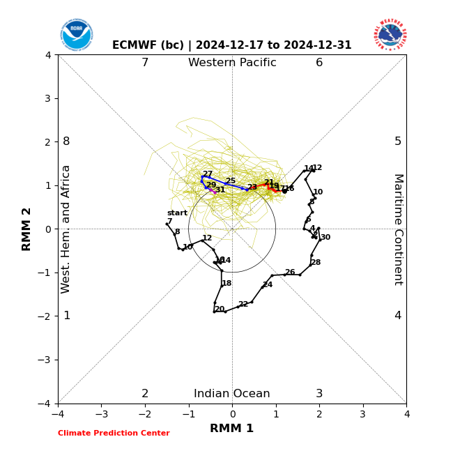 Dále bych chtěl rozebrat MJO, jelikož v posledních dnech jsem to sledoval podrobně. Zdá se, že se ze zaseklé fáze 4/5 přesouváme někam k fázi 7/8, takže patrně změna poměrně podstatné. Palma zde velice správně poznamenal fakt, že tato fáze bude blízko kruhu. Dnešní předpovědi ji lehce naopak oddalují, nicméně palma popsal správně fakt, že u kruhu jsou projevy minimální oproti projevům dále od kruhu.