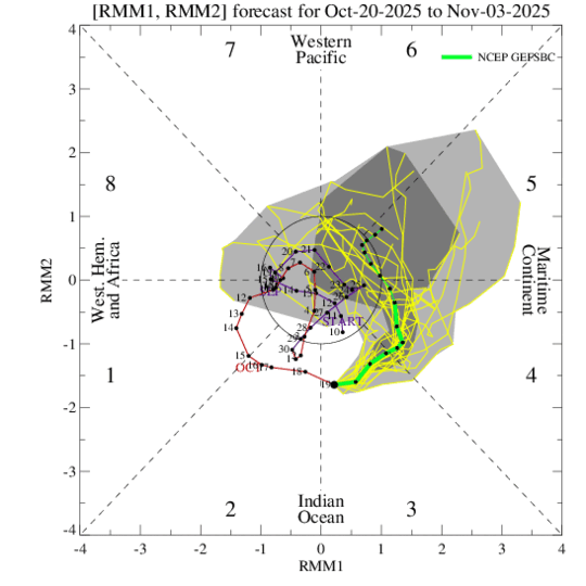 Velkou podporu by pak zhruba v polovině listopadu a dál mohla dát i fáze MJO mezi 7/8 a 8.1., což by pak mohlo podpořit konvekci nad pacifikem a opětovné nastartování rossbyho vlny, která by pak mohla směrem k prosinci přinést další kolo oslabování vortexu (viz některé ansámbly od ECMWF). Zatím je tato varianta spíše moji hypotézou, ale nějaké náznaky podobného výhledu jsou i od ECMWF a CFS, tak uvidíme zda to klapne.