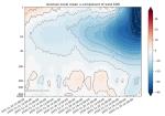 Čim více modré tim zápornější je odchylka od normálu pro rovnoběžkový směr větru U a tím slabší proudění ze západu.