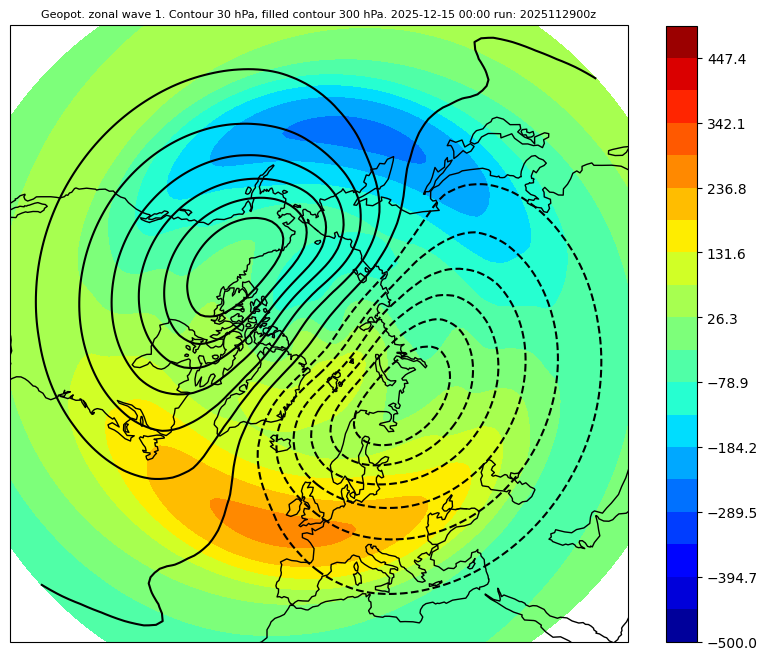 Situace nicméně začne být s prosincem aspoň v něčem pozitivní. Opět se po pauze vrací efekt planetárních vln. Zhruba na přelomu první a druhé dekády prosince budeme svědky výraznějšího nastavení účinku vlny wave-2. Výhled totiž dává možnost silně vyvinuté stratosférické vlně 2, která má potenciál narušit a rozdělit polární vortex. Vlna-2 Vyvolává dvojité proti-silové působení na vortex, nevyvolává pouze jeho vychýlení z osy (to by byla wave-1), ale natahuje a deformuje PV ve dvou osách, což často vede k oslabení nebo přímo splitu vortexu. Prvotní nájezd dojíždí v těchto dnech a další s velkou pravděpodobností dorazí zhruba na přelomu 1/2. dekády měsíce. Zároveň se v té době ukazuje další vlna účinků planetární vlny 1, tedy i nadále vychýlení vortexu (stratosférického) nad Sibiř, což pak umocňuje přenos tepla do jádra víru a následné možnosti oslabování, které se +/- v té době začíná modelovat. O tom jak tyto vlny fungují jsem psal v rozboru zde: https://diskuse.in-pocasi.cz/tema-11-7928-Jaka_bud...