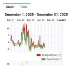 Škoda,že v tom grafu není vyznačen čarou průměr Tmax a Tmin,pak je na první pohled zřejmé,jak si současné teploty vedou.Ale je mi jasný,že k tomu je třeba delší souvislá řada měření aby jej bylo z čeho vypočítat.Pokud by současný charakter počasí vydržel do konce měsíce,prosincová průměrná teplota by byla někde v nížinách a středních polohách možná nižší,jak leckde na horách.