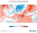 Teplotní odchylky podle ECMWF na příští týden. Připomíná to zimu 2023/24. Chladná Skandinávie a zbytek Evropy teplejší.