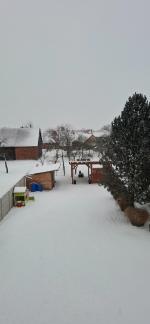 Večer dorazily sněhové přeháňky, ta jedna byla opravdu silná, velmi husté sněžení mix menších a větších vloček. Dnes ráno přechodně opět husté a silné sněžení.