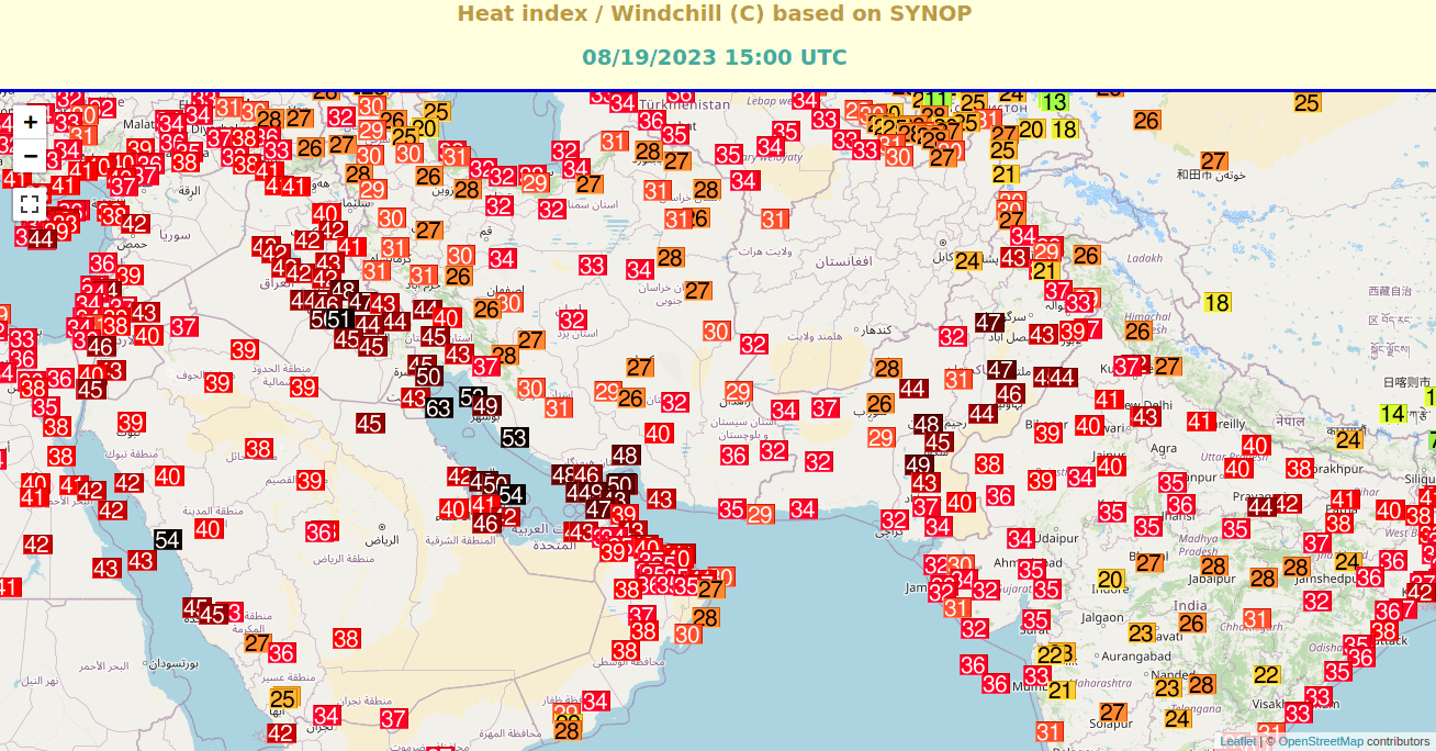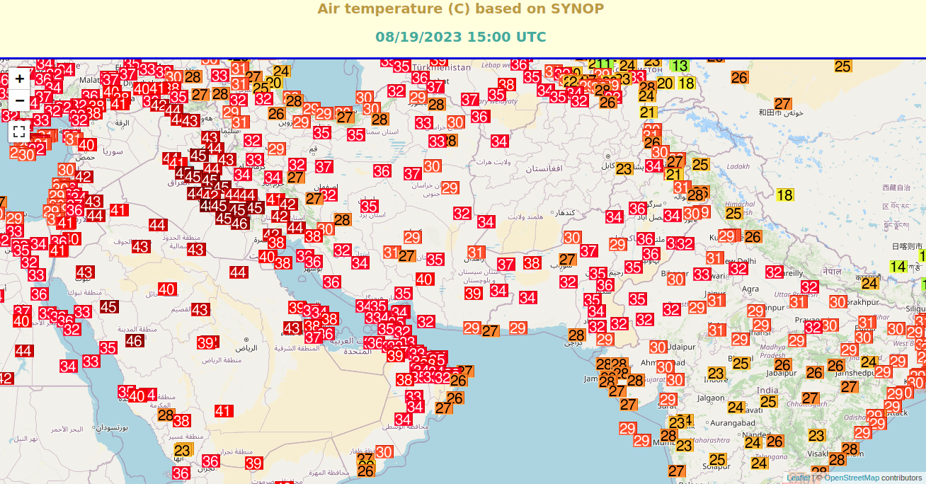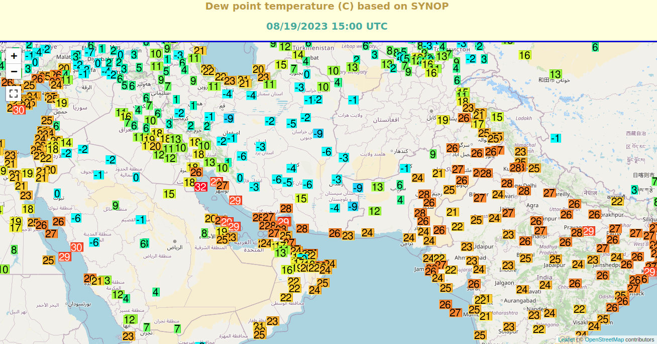 Tady je ukazka, jak spolu souvisi rosny bod, teplota, a index horka (heat index) na blizkem vychode vcera 19.08.2023 15 UTC. V Perskem zalivu vc. pobrezi, v Indii, pri joznim pobrezi Kasipckeho more je rosny bod velmi vysoky, ve vnitrozemi Iranu a Arabie velmi nizky a velmi niza vlhkost.