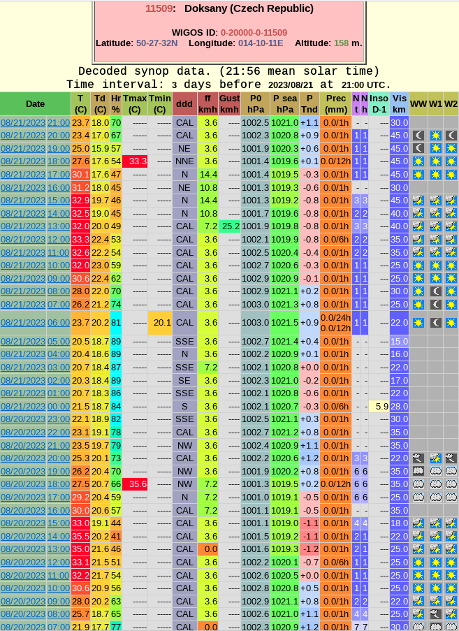Na stanici 11509 Doksany 158 m nad morem je 21.08.2023 odpoledne velmi vysoky rosny bod, navic pri vysokych teplotach, je jasno az polo-jasno, zadne srazky. V Doksanech 21.08.2023 10 UTC (12 SELC) teplota +32.0 °C a rosny bod +23.0 °C a teplotni index +36.8, denni Tmax +33.3 °C. A 20.06.2023 opet beze srazek, jasno az polojasno, nejvyssi rosny bod 20.08.2023 11 UTC (13 SELC) teplota +32.2 °C, rosny bod +21.7 °C, teplotni index +35.8 a take 20.08.2023 13 UTC (15 SELC) teplota +35.0 °C, rosny bod +21.6 °C, teplotni index +39.1 °C, denni Tmax 20.08.2023 +35.6 °C.