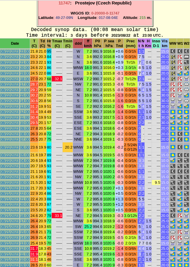 Na stanici 11747 Prostejov 215 m nad morem 22.08.2023 prumerny rosny bod +20.5 °C (z hodinovych terminu) 22.08.2023 17 UTC rosny bod +23.1 °C. Bylo to v dobe prichodu bourky uz.