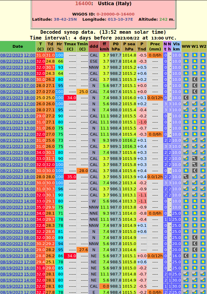 Rosny bod a teplotni index na Italskem ostrove 16400 Ustica 21.08.2023 07 UTC (09 SELC) teplota +32.0 °C, rosny bod +32.0 °C, vlhkost rel. 100 %, teplotni index +54.2 °C nevim jestli je Evropsky rekord, ale extrem zajiste.