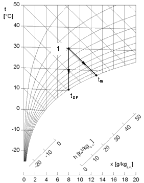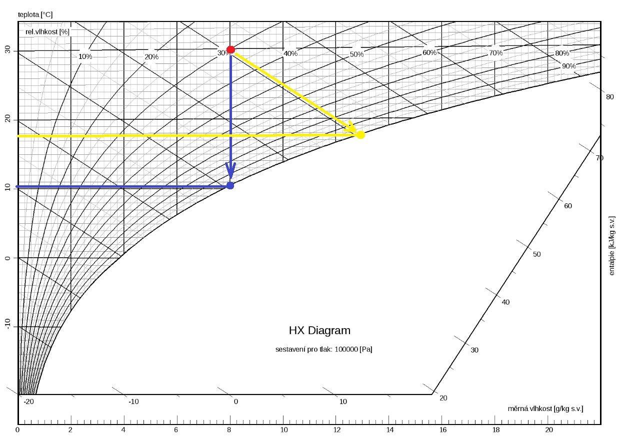 Na příloženém HX diagramu s vyznačenými parametry vzduchu, které někde zkopíroval Aces je zakreslený rozdíl mezi teplotou rosného bodu a teplotou mokrého teploměru. Delta T je větší než 7°C...!