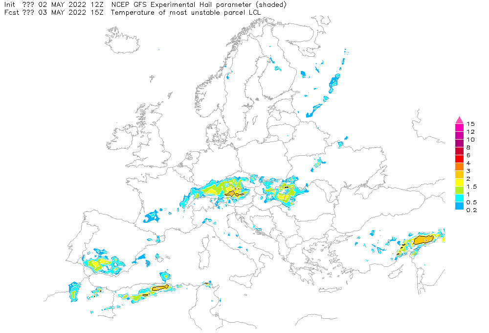 Jen pro zajímavost sem hodím experimentální předpověď od estofexu ohledně velikosti krup na zítřejší den (v 17 hodin). Jižně od ČR předpovídá i 3cm velké kroupy. V ČR do 2cm, což už nejsou úplně malé kroupy. Hodnoty cape zítra mezi 700-1000 J/Kg (Lifted index až -4). Lokální modely (jako např. aprege) mají i k 1500 J/Kg.