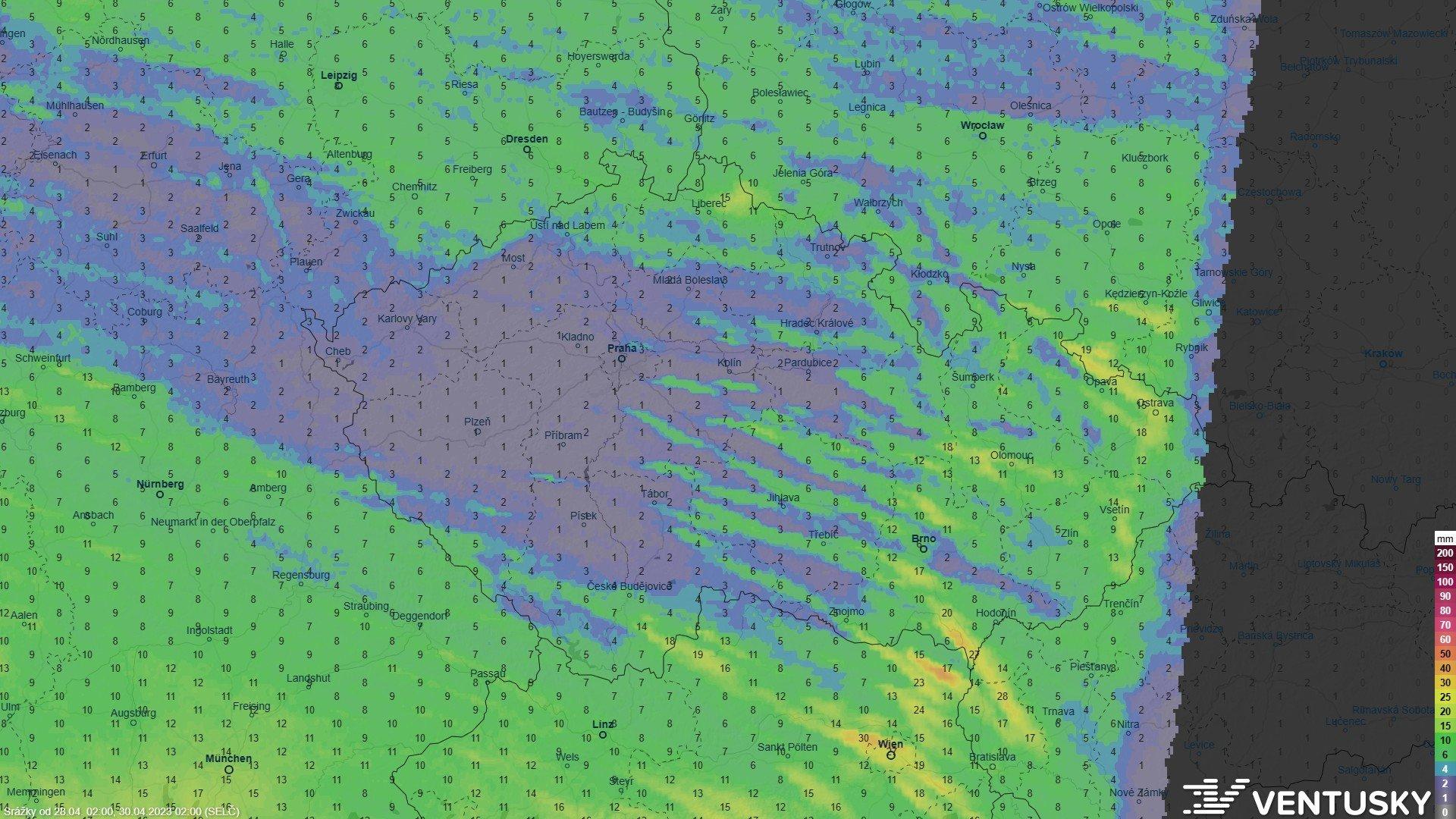 předpokládané úhrny do neděle - icon (de) 2:00, zdroj: ventusky