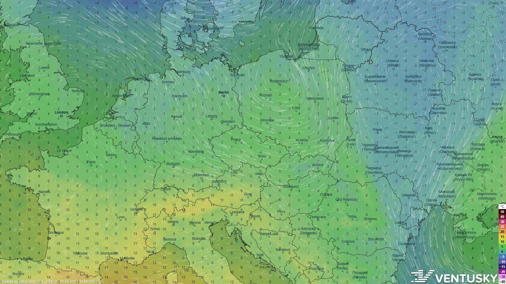 proudění v hladině 850 hPa - přiliv chladnějšího vzduchu od SZ kolem TN nad Polskem, zdroj: ventusky