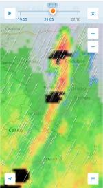 Už přes 3/4 hodiny diskotéka s neustávajícím hřměním Když to přicházelo, tak to takhle vytrvalé nebylo. Ty původně samostatné buňky nás podjely a vytvořily západní okraj systému. Vše se teď odehrává západní straně. K tomu jen lehce prší