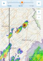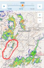Ve středním Německu se tvoří též silné přeháňky - bouřky, jejich postup je k východu až severovýchodu, modely předpokládají rozpad dále k východu, ale zatím to ničemu nenaznačuje. Tyto bouřky by mohly večer dorazit na západ/severozápad Čech. Jinak dochází k epxlozivnímu vývoji kupovité oblačnosti na jihu Čech a na severu Rakouska.. Nyní jsou již bouřky v severním Rakousku, jejich postup bude pomalý k východu až severovýchodu.