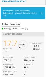 Aktuálně: se rozfoukal čerstvý až SILNÝ VÍTR od SZ s nárazy i přes 55 km/h, který přinesl výrazné ochlazení - až o 10°C. Zatímco před 2 hod. zde ještě byla tropická třicítka, nyní je již pod 22°C (až 17°C, měření může být zkreslené). Občas taky většinou jen slabě prší - tedy první, zatím neměřitelné červencové srážky Pocitovou teplotu dále snižuje vítr. Vlhkost mírně stoupla na příjemnějších ~65 - 70 % a dohlednost se tak trochu snížila.