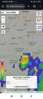 Tady dnes nejprve vystoupila teplota až na 34,7 °C, po 15. hodině už ale začalo více přibývat oblačnosti, takže dál ten vzestup nepokračoval. Asi o hodinu později už i trochu pokapávalo a poté se přidaly první hromy. Byla to MCS, ale moc silná nebyla, viděl jsem jen jeden záblesk a hřmělo tak jednou za 5 minut. Bouřku beru nakonec jako okrajovou, dva hromy byly dost hlasité, nejbližší blesk podle LightningMaps (blesky.bourky.cz už téměř nesleduji) uhodil nějakých 5-6 km od nás, to hlavní však zůstalo jihovýchodně. Slabší jádro bylo i na severozápad od nás, ale dál. Tady sice chvílemi pršelo až silně, ale úhrn se zastavil jen na 1,1 mm vody a to je i náš dosavadní úhrn v červenci. Spokojený jsem ale z poklesu teploty, asi půl hodiny nazpět bylo jen okolo 21 °C, teď to sice trochu stoupá, protože opět vylezlo Slunce, ale žádný výrazný vzestup to už dnes naštěstí nebude.