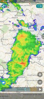 Tady kolem 17. hodiny velice vydatně pršelo. Zaregistroval jsem 3 blesky. Schytal jsem dnes snad nejvíce srážek z celé ČR. Ještě sem déšť z té bouřky od SZ, jež dosáhla vrcholu na Plzeňsku před hodinou. Doposud jsem dnes naměřil zaskočujících 34 l/m²!