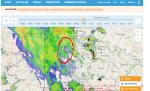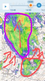 Díky blokaci od V nás drtivá většina srážkového pásma SF obtekla podél JZ a Z hranice..(fialová)