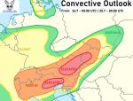 Ve čtvrtek se nad střední Evropou udrží slabé tlakové pole a počasí v Rakousku, částečně na Slovensku a ve vnější části České republiky bude ovlivněno mělkou oblastí nízkého tlaku nad Maďarskem. Modely zatím naznačují, že největší ohnisko bouřek bude od Alp na severovýchod odpoledne. Hrozí převážně přívalové srážky, silnější poryvy větru a lokálně krupobití, hodnoty střihu větru se s postupujícím večerem budou zvyšovat na hodnoty až 25 m/s. Nelze vyloučit večer systém MCS, který se bude rychle přesouvat na severovýchod s rizikem silných poryvů větru na frontě nebo přímo v jeho jádrech. S postupující nocí se riziko krupobití sníží a celková bouřková aktivita by měla v první polovině noci nad jižním Polskem slábnout.