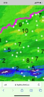Já se spíš ptal, jestli je nějaký odkaz. Případně mi může napsat do SZ, kde to bylo změřeno. Já jen, že prostě nikde tu hodnotu nevidím, tak mně to zajímá. A k tý barvě, je to jen elektronicky spočítáno z dat radaru, a i srážkoměrů, ale jen ČHMÚ, a tam v Mostě žádný není