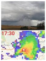 Nám se taky poštěstilo a z buňky, která nás obcházela těsně severně taky zahřmělo. Nad námi se nakonec chtěla rozrůst a spojit s buňkami jižněji, takže i sprchlo. Za dnešek máme pěkných 10.2 mm. No nečekal jsem, že v letošní sezoně uvidím ještě blesk, dokonce CGčko.