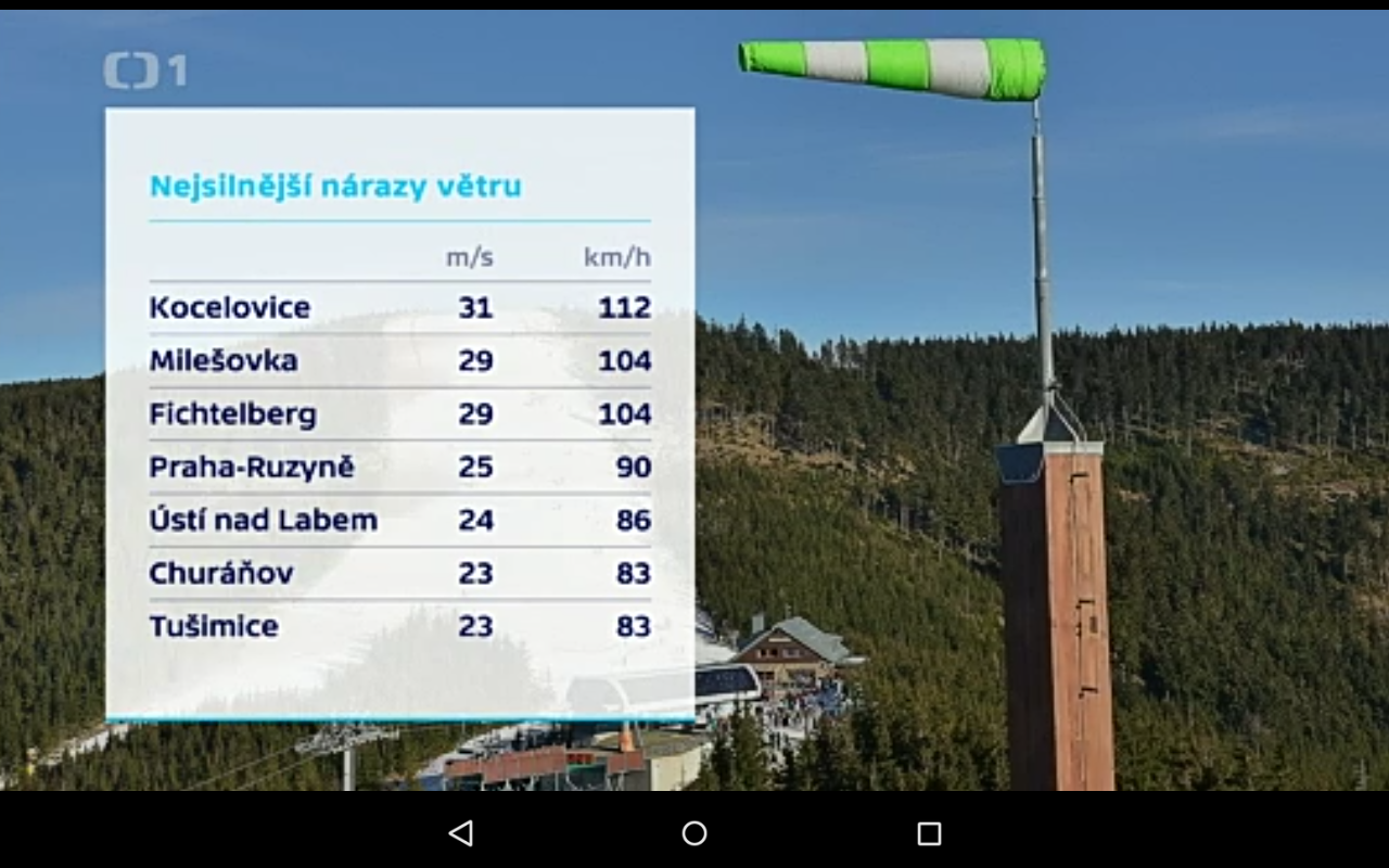 Naraz vetru podle Infomet 38 m/s (137 km/h) na Ceske Snezce, na Ogimetu maji naraz pro Ceskou Snezku 40 m/s - 144 km/h). Poska Snezka na strese ma naraz jen 29 m/s v hodinovem vypisu, 05.03.2019 rano 35 m/s a pro Ceskou Snezku rano 05.03.2019 dokonce 48 m/s coz je asi nesmysl.