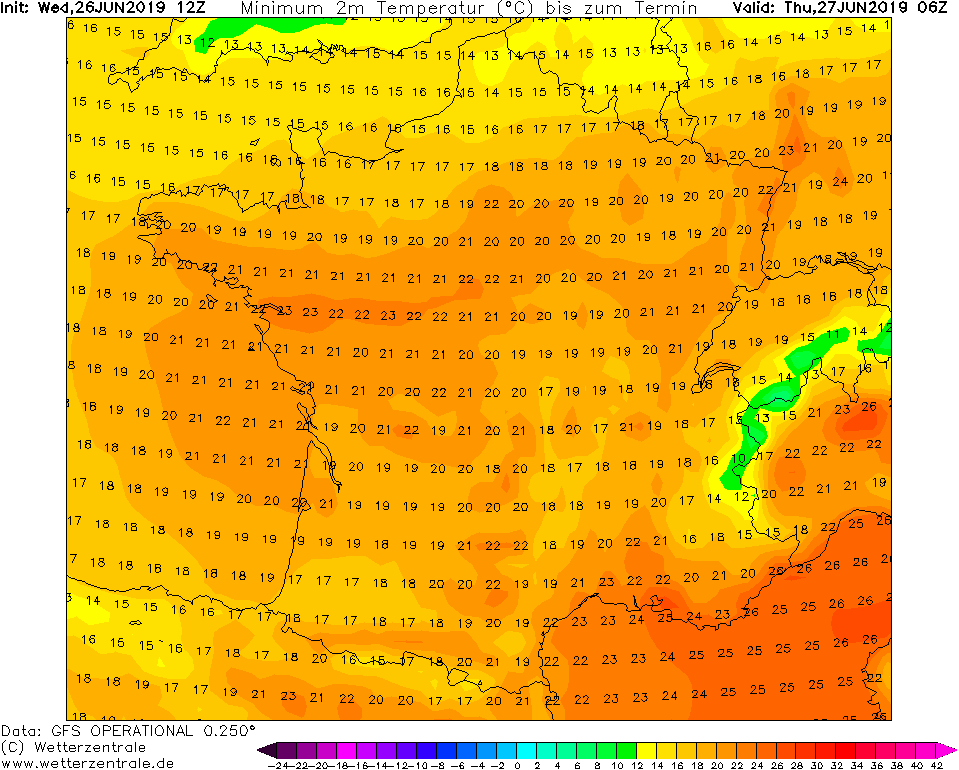Noc na 22.06.2019 byla extreme tepla, vsude mozne tropicke noci. V Polsku dali absolutni rekord nejvyssi Tmin - Tnx +24.0, Absoltutni rekord Tmax pro Polsko take padl (cervnovy).