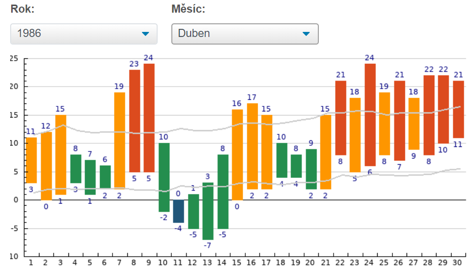 Beze sporu to bylo v tom dubnu 1986 zajimave. Pocasi skutecne skakalo ze snezeni do letnich dnu. 07-09.04.1986 se vyskytla na zacatek dubna velmi tepla vlna a na mnoha stanicich byl pri teto vlne zaznamenan letni den. V prvni polovine ledna je letni den pomerne vyjimecny, ale obcas se vyskytne. Rekordne nejdrivejsi znamy letni den v CR je 21.03.1974 Caslav - Nove mesto +25.4 °C a breznovy rekord Txx v CR je Znojmo 23.03.1927 +26.3 °C, 22.03.1927 Melnik +26.2 °C, 21.03.1974 Caslav - Nove mesto +25.4 °C (Chotousice 21.03.1974 +26.0 °C opraveno na +24.6 °C), Podebrady 31.03.1968 +25.6 °C. Rekordne nejdrivejsi tropicky den v CR je 21.04.1968 Decin +31.7 °C, dale 22.04.1968 Decin +30.8° C a Neumetely +30.2 °C a rekord Txx v CR pro duben je 29.04.2012 Brandys nad Labem St.B. +31.8 °C, Plzeň Bolevec +31.8 °C, Horni Pocatky +31.8 °C (Praha Rez 27.04.2012 +34.6 °C JE CHYBA), (Karlovy Vary 24.04.1962 +32.3 °C vyvraceno - spravna hodnota +27.3 °C, Beroun +32.0 °C v dubnu podle NKP 30 z roku 2021, datum ?).