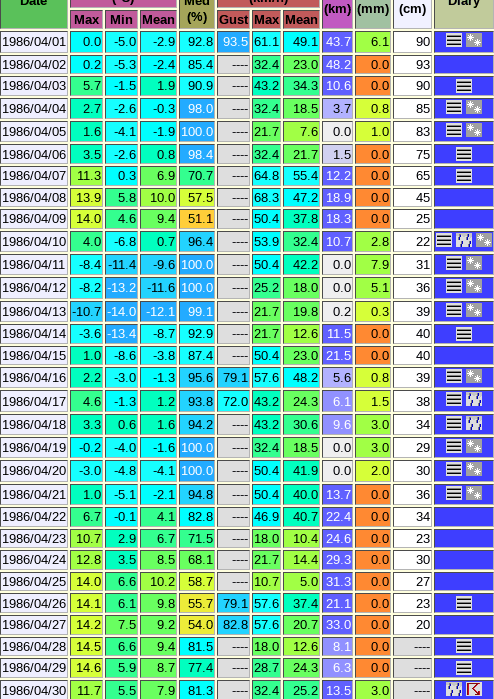 V dubnu 1986 na stanici 11782 Ostrava Mosnov 08.04.1986 Tmax +26.7 °C a 11.04.1986 Tmax +0.1 °C. V Bohumine pak [b]08.04.1986 Tmax +27.2 °C a 12.04.1986 +1.2 °C. Ve Zline bylo dosazeno 08.04.1986 Tmax +27.0 a 12.04.1986 Tmax +3.0 °C i 13.04.1986 Tmax +3.0 °C (11.04.1986 Tmax +8.0 °C). Opet to vypada, ze pri proudeni velmi tepleho vzduchu (navic po chladne epizode) byla inverze minimalne v ramci Theta a v zavetrnych mistech byly teploty nejvyssi. Dokonce Vyssi Brod 08.04.1986 Tmax +28.1 °C a 12.04.1986 Tmax -1.0 °C. ale Hejnice kupodivu jen 08.04.1986 Tmax +14.4 °C, As 08.04.1986 Tmax +11.7 °C. To vypada na rozhranni teple a studene vzduchove hmoty. Hejnice je ve Frydlantskem vybezku na severu, v typicke zavetrne oblasti. Data v archivu na in-pocasi.cz jsou ze stanic pod CHMI a zde je udavano Tmax i Tmin 21-21 MST (ccca 21-21 zimni cas, 22-22 letni cas, 20-20 UTC). Tmax a Tmin podle CHMI je proste od vecera do vecera. To muze denni maxima a minima zkreslovat.