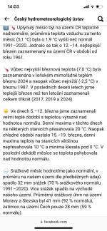 Tak ještě než přijde zpátky zima , v rychlosti se můžeme podívat na březen. Na většině území skončí lehkým nadprůměrem, místy bych to viděl i solidní nadprůměr. Březnový průměry, jsou velmi často ovlivněné umístěním stanice. Takže klasika větrnější stanice, hlavně ve východní části republiky, si drží lehce vyšší průměry, ale o pár km je to úplně jinak, často i v rámci měst či obcí. Naopak údolní stanice, si drží ten průměr nižší, i když tam denní teploty, byly vysoké. No vzhledem k tomu, že průměrná teplota pro březen je v nižších polohách většinou 4-5°C, letos to bude většinou 4,5°C až 7,5°C. Z těch dat třeba Brno-Tuřany 7,6°C, Praha-Karlov 7,5°C, Ostrava-Mošnov 6,4°C, Prostějov 6,4°C, Čáslav-Chotusice 6,3°C. No uvidíme, za pár dní vyjde první hodnocení ČHMÚ. Osobně bych tipoval okolo 1,5°C nad průměrem za republiku. V Čechách okolo 1°C, na Moravě okolo 2°C, nad DP