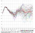 V tomto místě spadlo cca 40 mm. Když se podíváme na předpověď ansámblů, většina z nich se pohybuje na těch cca 30 - 40 mm, s tím, že hlavní běh dává 50 mm, průměr všech ansámblů je lehce pod 30 mm cca 28 mm. Dalo by se říct velice přesné. Nejnižší ansámbl (světle šedý číslo 19) má 14 mm, tedy jakási spodní hladina, ale tyhle nejvyšší/nejnižší málokdy vyjdou.