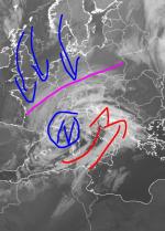 Vytvořilo se na severním okraji středomořské TN a do toho se nasouvá chladnější vzduch od S, SZ..