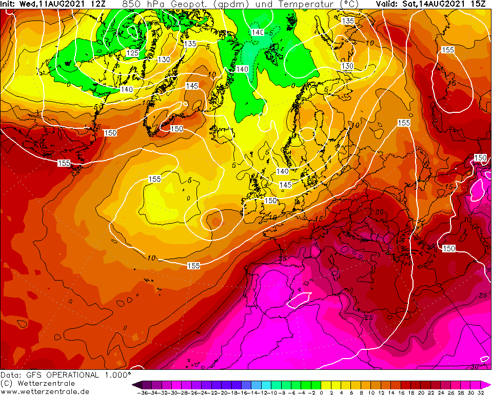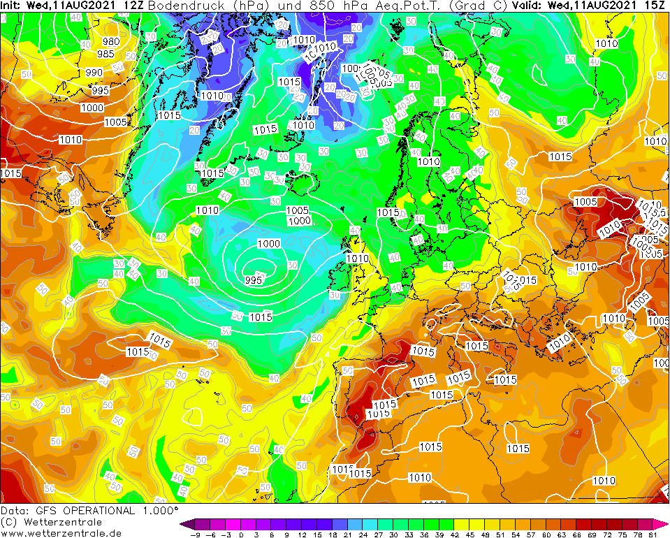 GFS Wetterzentrale Evropa 11.08.2021 12 UTC +3 hod na 15 UTC