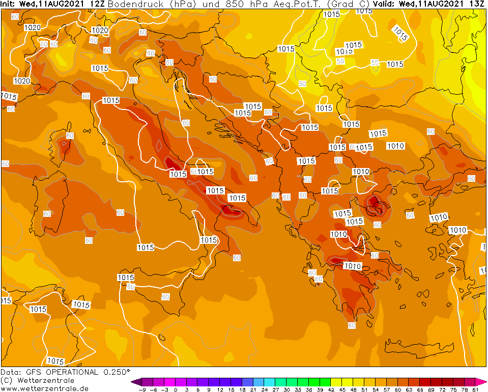 GFS Wetterzemtrale Italie-Balkan 11.08.2021 12 UTC +1 hod na 13 UTC