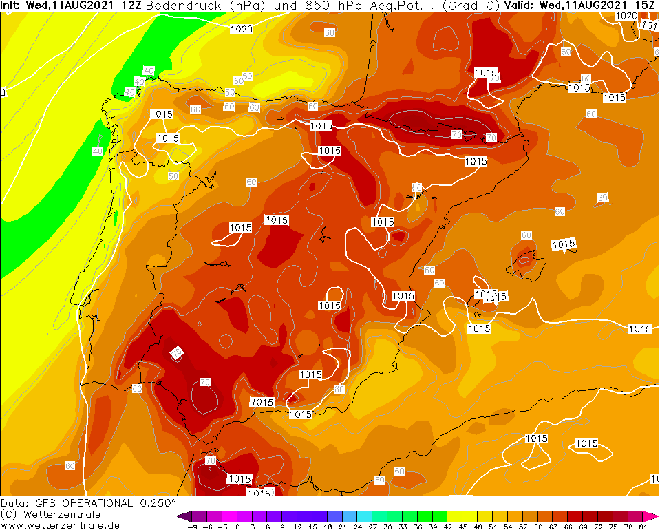 11.08.2021 odpoledne 12-15 UTC Nad Tunisenm je sred pomerne velke tlakove vyse, bezvetri a jasno jsou pricinou vysokych maxim. Poz zadni strane vyse proudi vzduch z jihu Alzirska do zapadniho Sredomori, do Sardinie a odtud jako severo-zapadni vitr na Sicilii. Nad Sicilii presahuje na jiho-zapade teplota v 850 hPa +30 °C, v Sardinii, Kalabrii, ale i v Reckych a Albanskych horach az +29 °C. V Tunisu teplota v 850 hPa dosahuje az +32 °C. Ve vychodni casti Spanelska (v horach) je dosahovano az 30-31 °C v 850 hPa na nekderych mistech, ale i ve stredni-severni casti az +29 °C. ThetaE v 858 hOa dosahuje na Sicilii 55-60 °C, v Sardinii az nad +60 °C a v Kalabrii v horach i nad +70 °C, Ve Spanelsku dosahuje ThetaE v 850 hPa ve vychodni casti 65-70 °C, nad +70 °C v oblasti Sevilly a Pyrenei. Odchylka teploty v 850 hPa dosahuje nad Stredomorim 8-10 °C, ve Spanelsku na nekterych mistech i nad +12 °C.