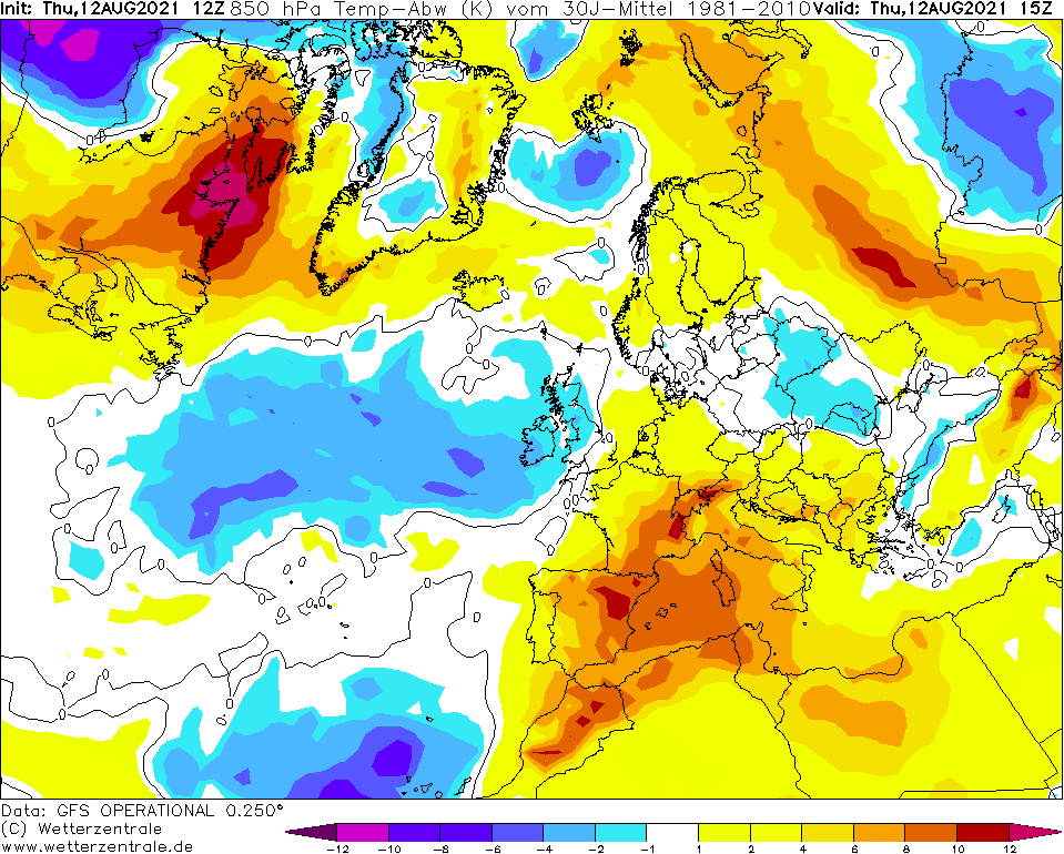 Ve Spanelsku je ocekavana 13-15.08.2021 velka oblast T850 30-33 °C a odchylka T850 od normalu 10-14 °C. I nad Sevillou lze ocekavat T850 okolo +31 °C. Ve Spanelsku jsou predpovidana maxima az 47-48 °C, nebo dokonce i presazeni +50 °C. Padne nejspis absolutni rekord pro Spanelsko a asi i pro Evropu. Absolutni stavajici oficialni rekord pro Spanelsko je 13.07.2017 Montoro - Cordoba oblast +47.3 °C a pro Portugalsko Amareleja - Beja 01.08.2003 +47.4 °C. Absolutni oficialni rekord pro Evropu je 10.07.1977 v Recku Elefsina +48.0 °C a v Athenach letiste Tatoi Airport +48.0 °C. Jinak je pro Recko udavano i novejsi absolutni maximum (po roce 2000) Nea Filadelfia AWS 26.06.2007 +47.5 °C a velmi nedavno blizko absolutnimu maximum Langadas 03.08.2021 +47.1 °C. Absolutni rekord pro Maltu je z Luqa - Malta International Airport 09.08.1999 +43.8 °C (geoclimat.org uvadi jeste Nadur (Gozo Isl.) 09.08.1999 +44.4), coz koordinuje s neoficialnim rekordem pro Evropu - Catenanuova v Italii 10.08.1999 +48.5 °C. Vcera byl vsak na neoficialni stanici dosazen absolutni rekord pro Evropu - v Italii (Sicilie) 11.08.2021 SIAS Siracusa C.Da Monasteri +48.8 °C resp. +119.8 °F (den pred tim na stejne stanici +47.0 °C). Jedna se o neoficialni zemedelskou stanici.