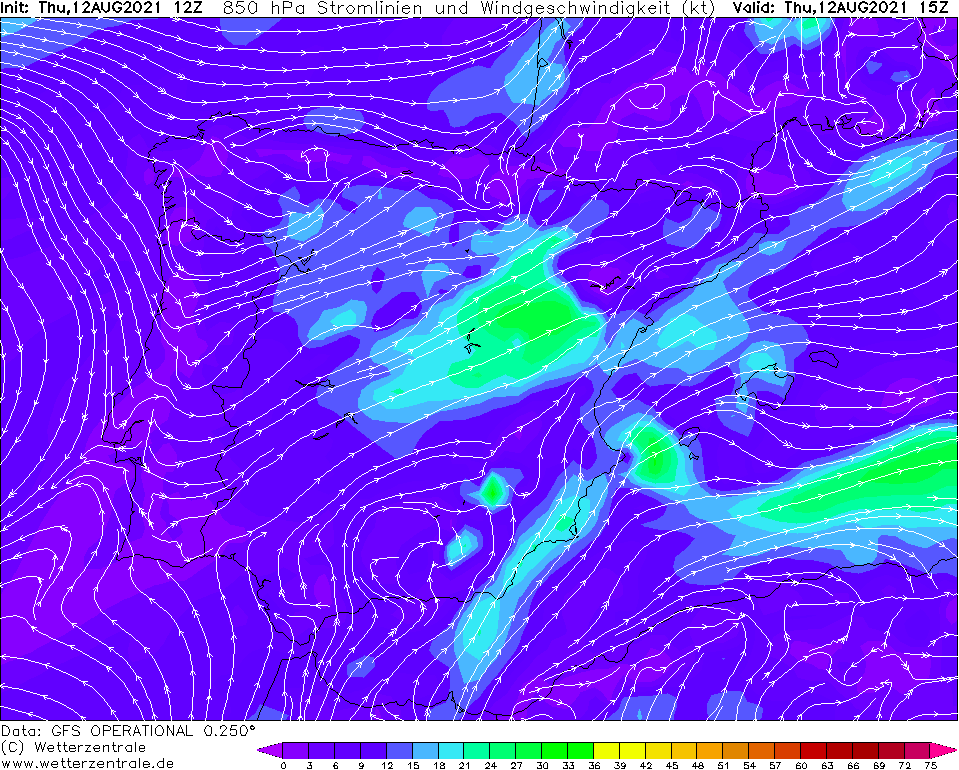 GFS Wetterzemtrale Spanelsko-Portugalsko 11.08.2021 12 UTC +3 hod na 15 UTC