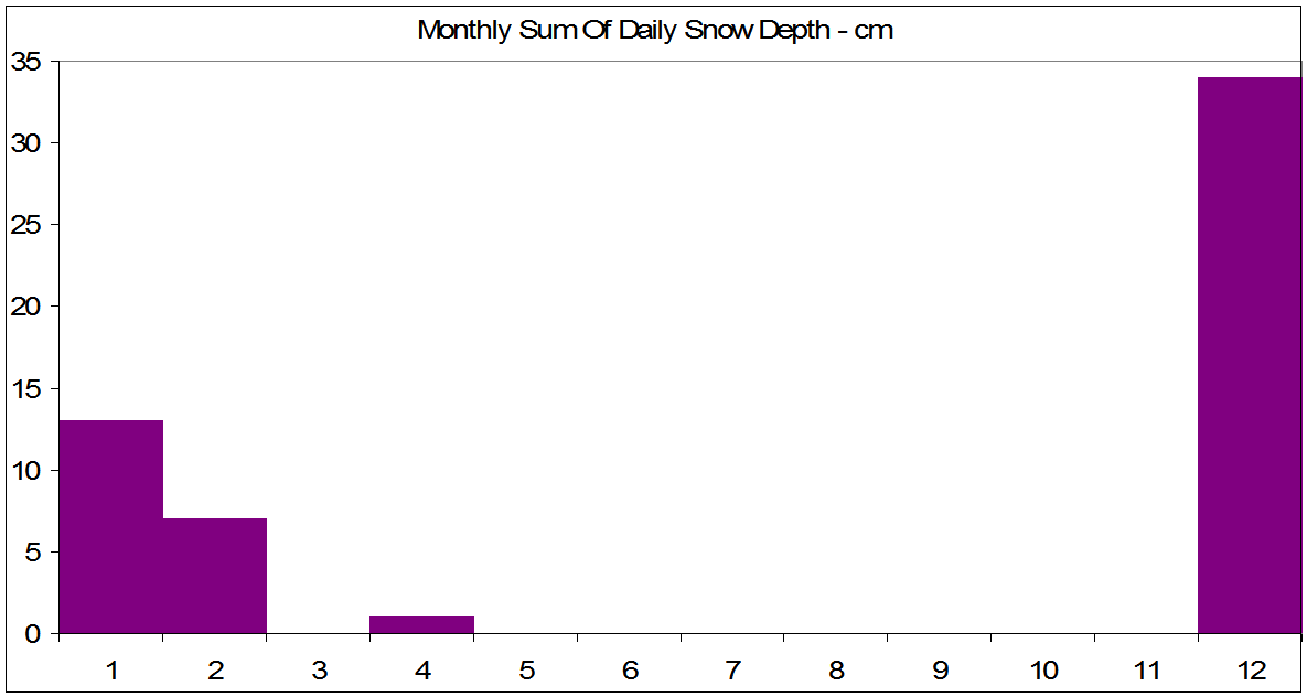 Suma denni vysky snehu je celkem 55 cm za rok, 34 cm v prosinci, 13 cm v lednu, 7 cm v unoru a 1 cm v dubnu, ostatni mesice 0 cm. Nejvyssi vyska snehu byla dne 10.12.2021 7 cm.