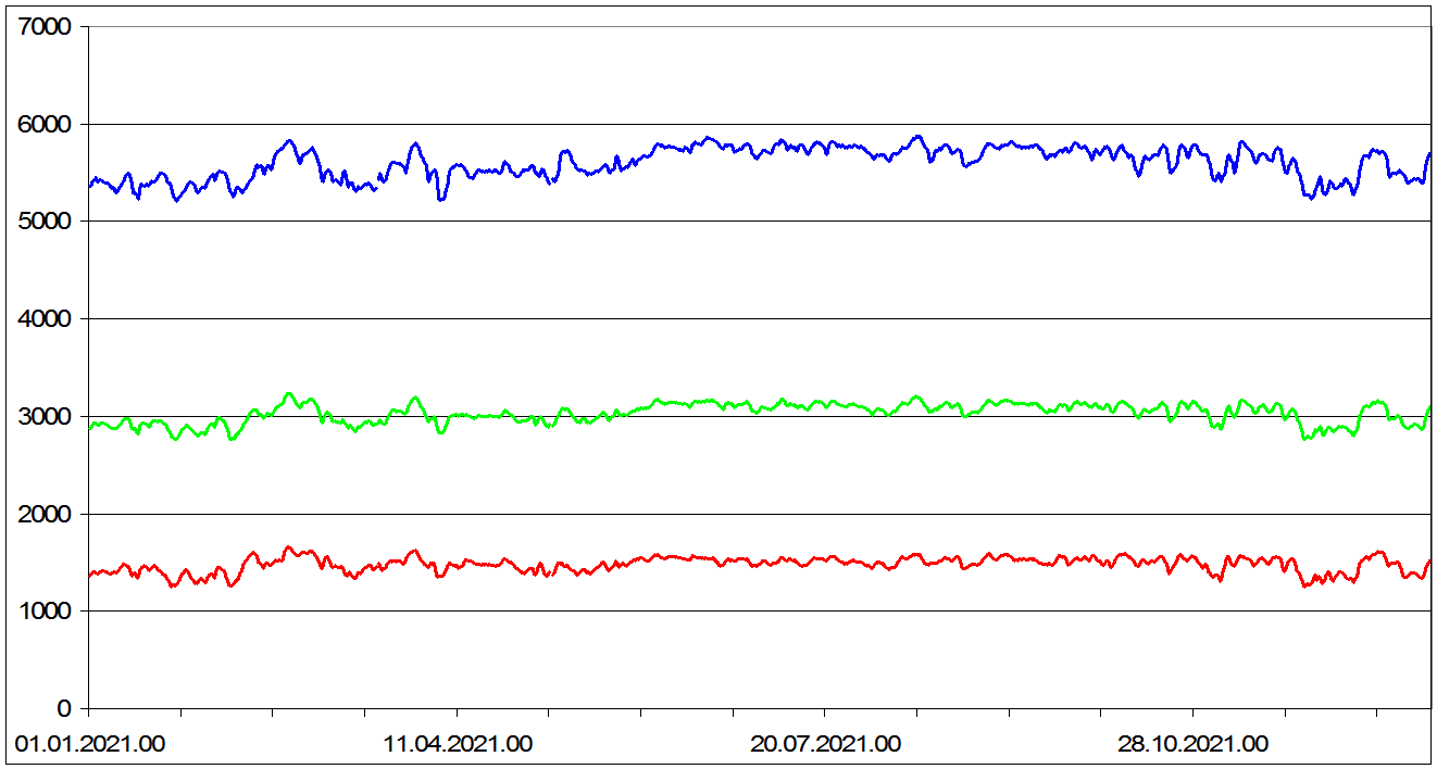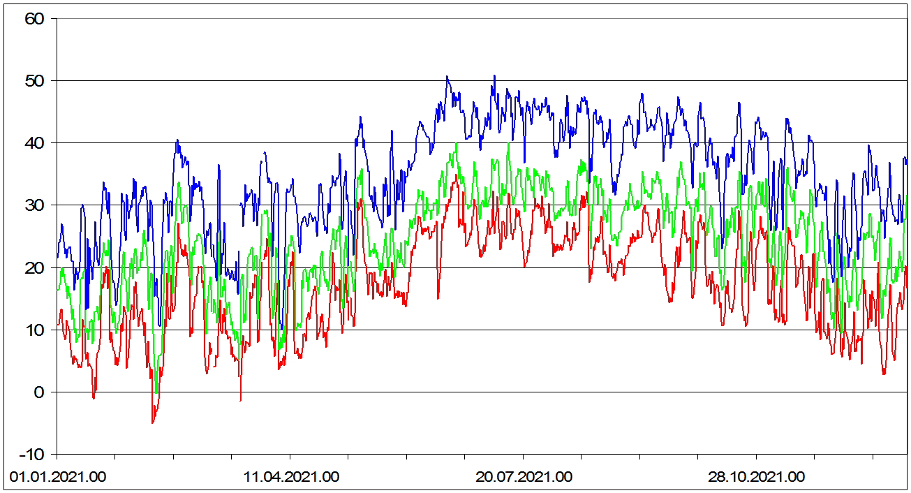 Tri standardni hladiny 850 hPa cervene, 700 hPa zelene, 500 hPa modre Jednotlive veliciny.