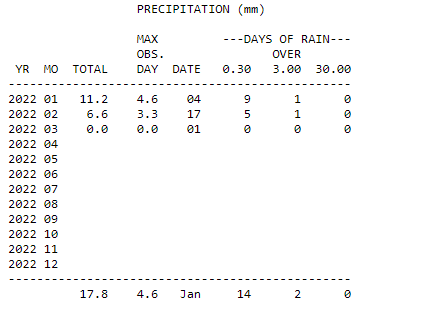Za leden 27 mm, za únor 25 mm. Suma 52 mm. Normál na konci února je cca 80 mm. Výhled s velkým otazníkem od 14ti denního sucha po cca 10 mm. Díky vlivu TV se obávám, že to bude spíše beze srážek. Naštěstí se nástup tepla zatím posouvá ze začátku března někdy k půlce (což je jenom dobře).